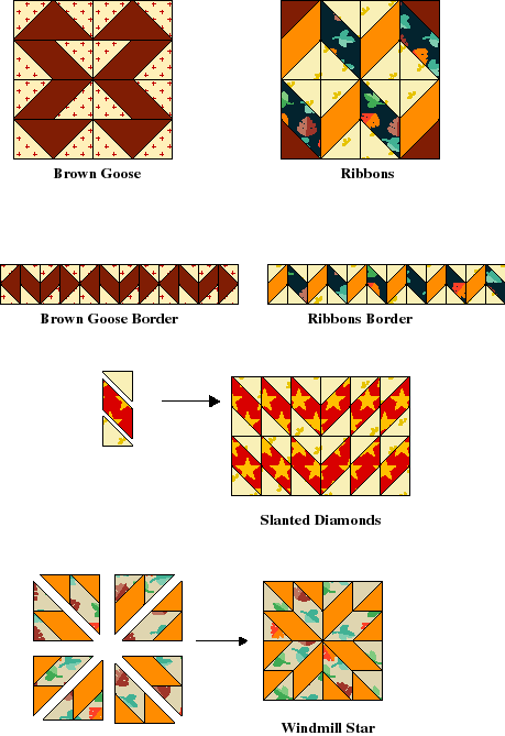 The Brown Goose block uses the very same patches as the Enigma Block yet its look is very different. Taking just one half of the block, a border sequence can be formed and then repeated to the length of your quilt. The Ribbons Block uses just the parallelogram and the half-square triangle. It also makes a nice border sequence using, again, a half block unit. Slanted Diamonds also uses just the parallelogram and the half-square triangle. The single unit shown can be combined in many different ways for a border repeat. Try reversing the diamonds at the center or just keep them oriented in the same direction.